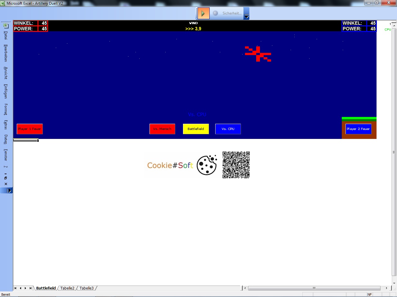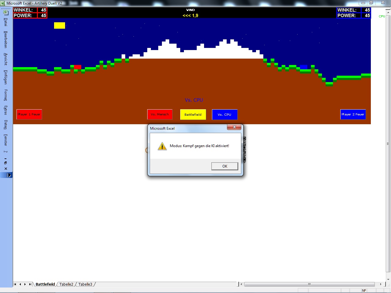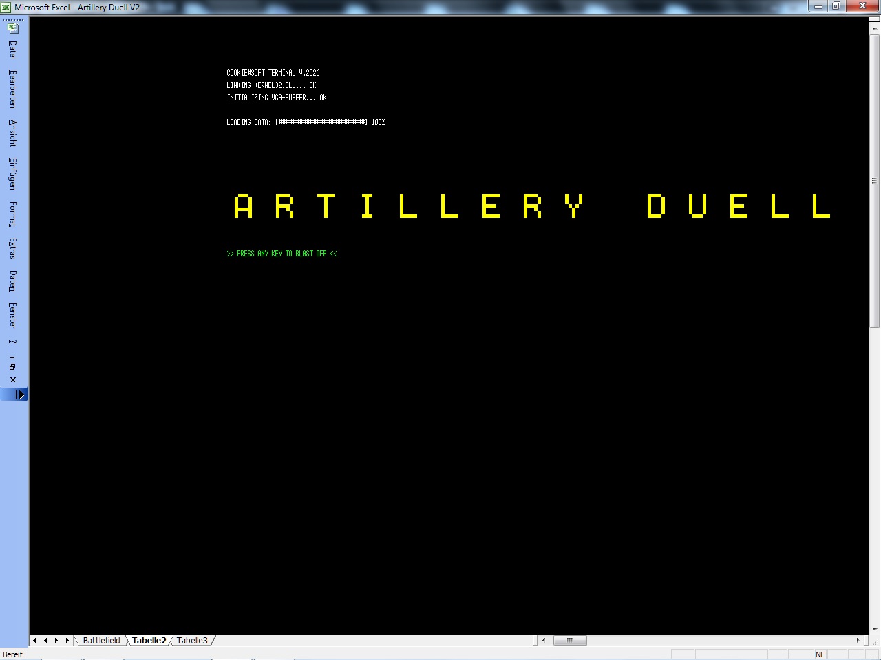 Artillery Duell für deinen Excel Desktop. Komplett Programmiert in VBA 2003. Spielbar Mensch vs. Mensch oder gegen den CPU. Ein echter Retro Klassiker wie damals auf dem C64! Coole Sound's, Effekte, Easter Egg's..