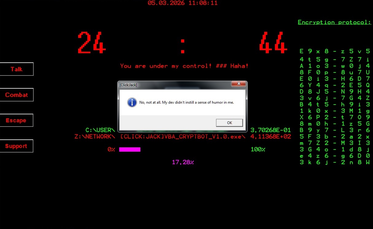 The Crypto-Bot Click:Jack has breached your defenses. He is already siphoning your data and preparing to encrypt your entire hard drive.